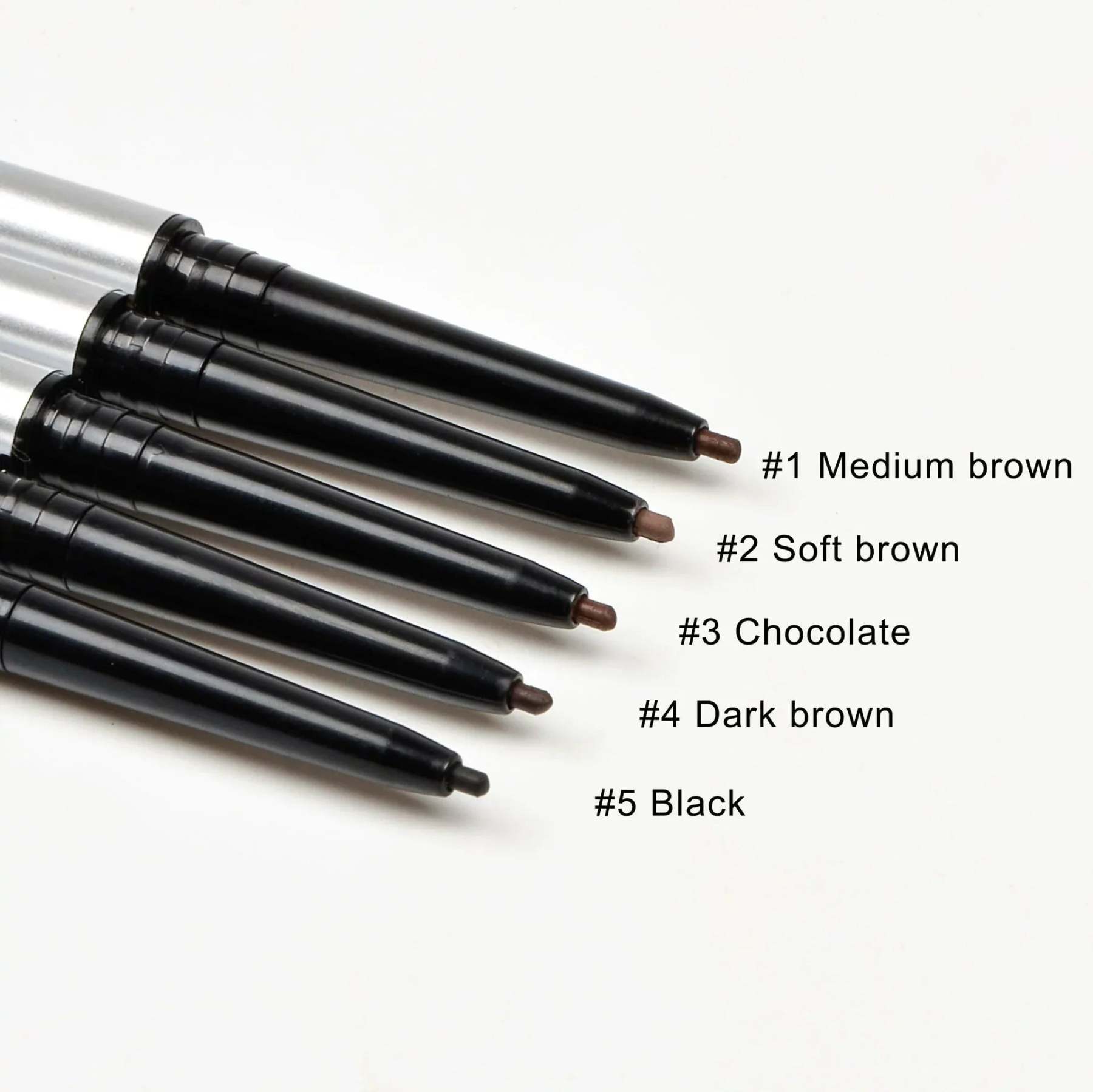 #1. Medium brown color is suitable for daily natural makeup; #2 soft brown color suitable for gentle light makeup; #3 chocolate colors are suitable for creating three-dimensional heavy makeup; #4 dark brown color suitable for vintage makeup look; #5 black is suitable for cool and stylish makeup.