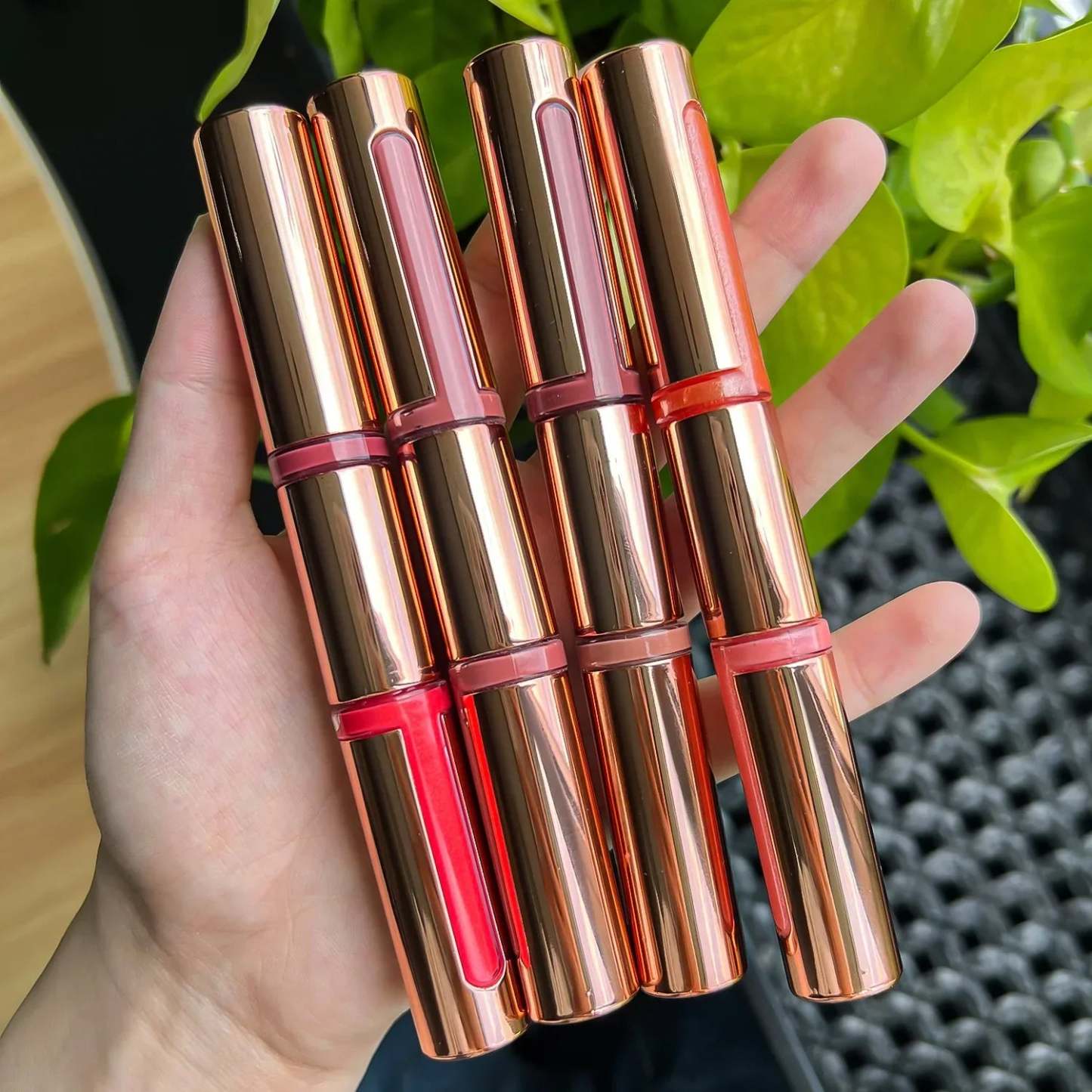 ☕Sydney coffee shop owner Ms. Rodriguez said, "Running a Sydney coffee shop is extremely busy, and this double ended lip gloss is so practical! I chose coral powder and clay brown, used pink to enhance my complexion in the morning, and changed to brown to match the decoration of the shop in the afternoon. My makeup is amazing, and even after drinking coffee, it didn't fade. Customers thought I had applied a customized lip color!"